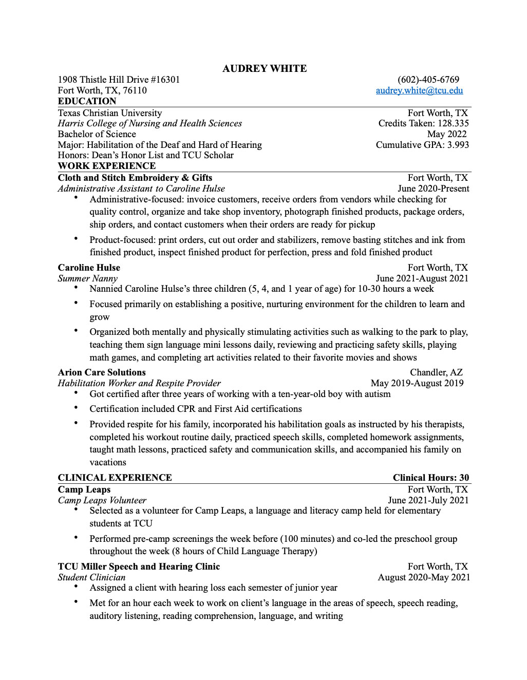 I have achieved Dean’s Honor List for my outstanding academic achievement all of my semesters at TCU. After receiving a 4.0 GPA for the semester, I was named a TCU Scholar Fall 2018, Spring 2019, Fall 2019, Spring 2020, and Spring 2021.